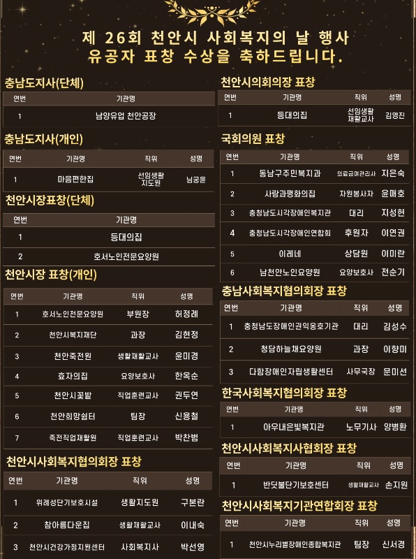 제 26회 천안시사회복지의 날 행사 유공자 표창수상 페이지 정보 작성자작성자 : 천사협 조회조회수 : 670회 작성일작성일 : 25-09-23 13:14 본문 수상을 축하 드립니다! 목록 다음글「제26회 천안시사회복지의 날 행사」사회복지 유공자 추천 협조 요청 25.07.28